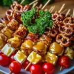 Brezel-Käse-Spieße mit süßem Senf sind nicht nur ein visueller Hingucker, sondern auch ein Geschmackserlebnis, das Sie mit jedem Bissen an die Gemütlichkeit einer traditionellen deutschen Bierevent erinnert. Egal, ob es sich um ein geselliges Beisammensein im Garten, einen gemütlichen Abend mit Freunden oder eine festliche Feier handelt – dieses Rezept bringt die Freude des Teilens mit köstlichen Bissen in perfekten Portionen auf die Teller.