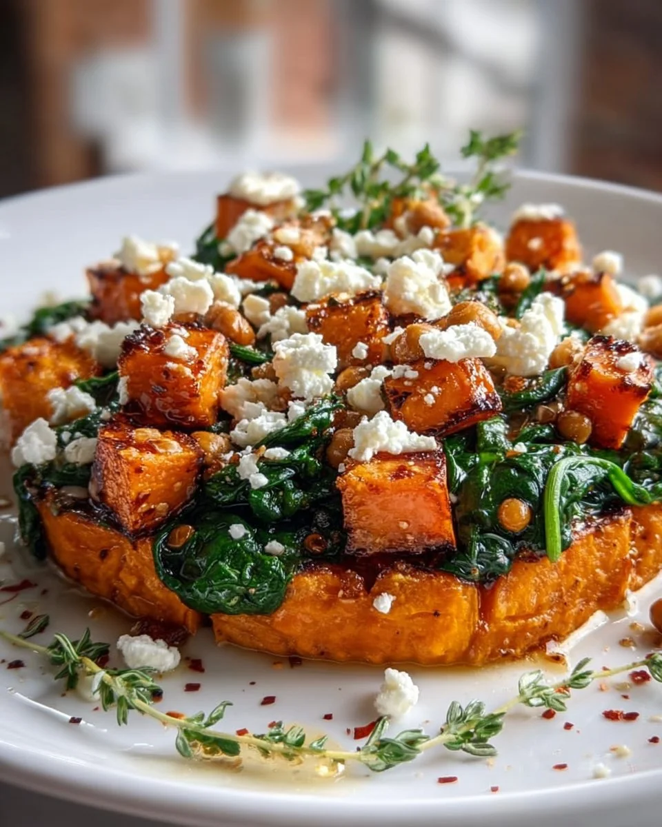 Gesunde Honig-Feta Süßkartoffelpfanne mit frischem Spinat