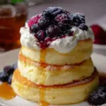 Zarte, luftige japanische Soufflé-Pfannkuchen, die mit einem Hauch von Vanille und Zitrone verfeinert sind – ein Frühstückserlebnis, das alle Sinne anspricht.