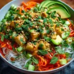 Ein erfrischender und vielseitiger Salat mit Reisnudeln, buntem Gemüse und einem köstlichen Erdnuss-Dressing.