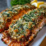 Garnieren und servieren: Garnieren Sie das Gericht mit frisch gehackter Petersilie und servieren Sie es sofort. Der Anblick von der goldbraunen Kruste und dem saftigen Lachs wird jeden an den Tisch locken.