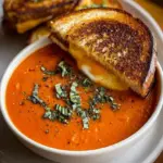 Eine köstliche und herzhafte geröstete Tomatensuppe, perfekt kombiniert mit goldbraunem gegrilltem Käsebrot.