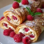 Fluffige Pfannkuchenröllchen gefüllt mit frischen Himbeeren, ideal für ein besonderes Frühstück oder Brunch.