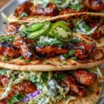 Diese Tacos kombinieren zartes Hähnchen in einer süßen Honig-Knoblauch-Sauce mit frischem Gemüse, serviert in warmem Naan.