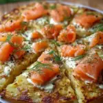 Diese köstliche Kartoffelpizza vereint knusprige Kartoffelkruste mit cremigem Kräuterfrischkäse und geräuchertem Lachs.