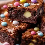 Saftige und schokoladige Osterbrownies mit bunten Osterbonbons, die Freude und Farbe in jedes Stück bringen.