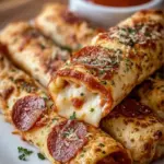Köstliche, goldbraune Pizza-Roll-Stäbchen gefüllt mit Mozzarella und Pepperoni, perfekt für jeden Anlass.