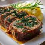 Ein herzhaftes Fest für die Sinne: Rinderhackbraten mit einer würzigen Füllung aus frischem Spinat und Pilzen, ideal für festliche Anlässe oder ein gemütliches Dinner.