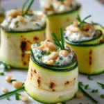Ein leichtes und frisches Gericht aus Zucchini-Röllchen mit cremigem Frischkäse und gerösteten Pinienkernen, ideal als Snack oder Vorspeise.